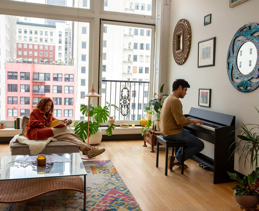 Slim, stylish, and affordable, the F107 brings exceptional piano performance to your modern living space. Featuring a streamlined design based on the award-winning F701, it blends perfectly with contemporary furnishings. You get best-in-class tone and touch as well, thanks to the same sound engine and keyboard action found in higher-end Roland pianos. And with onboard Bluetooth®, you can elevate your musical enjoyment with mobile devices and the companion Roland Piano App.